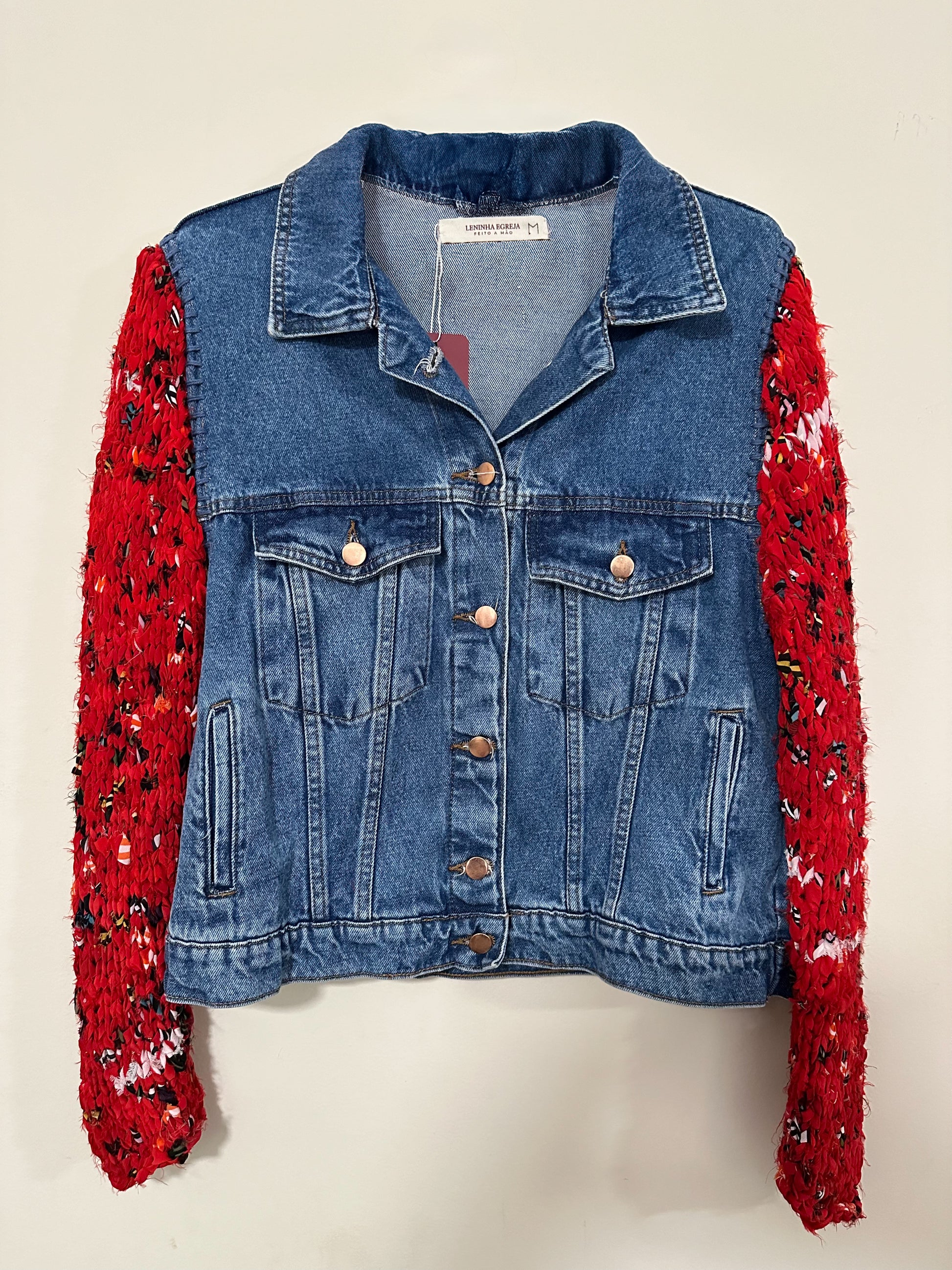 Jaqueta jeans com mangas tricotadas com tiras de seda vermelho - cod 903 - 56x47cm